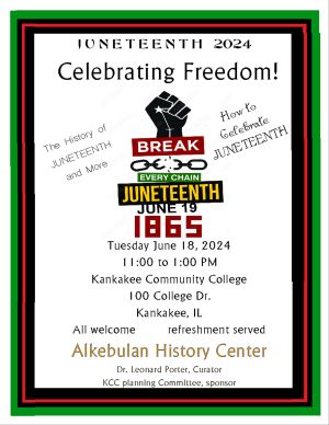 Dr. Leonard Porter, who is a member of the Kankakee County Juneteenth Committee, will be at KCC today to give a presentation on The History of Juneteenth, 11 a.m. - 1 p.m. in Room D152, the Iroquois Room.