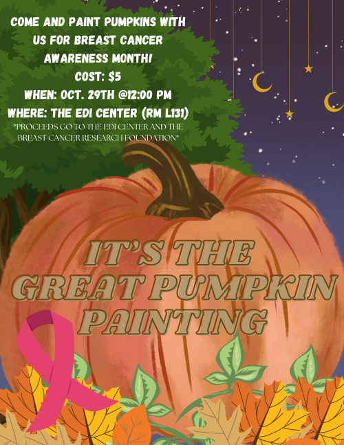 Stop by the EDI Center on Tuesday, October 29th at 12:00 p.m. to paint a pumpkin for Breast Cancer Awareness Month!